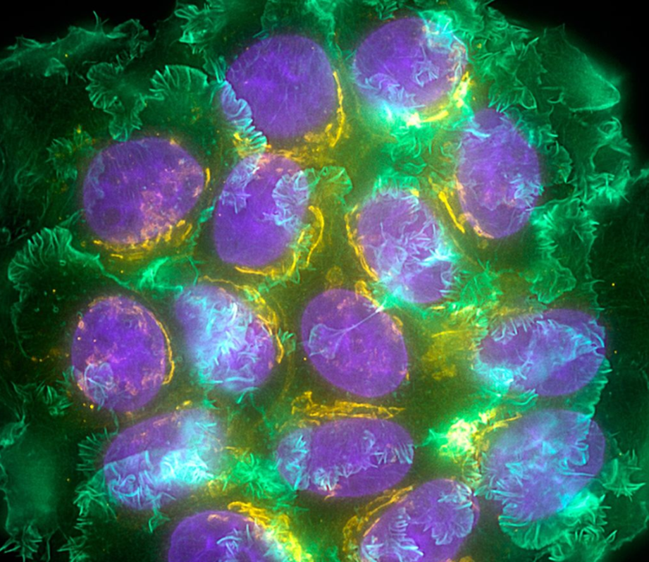 El cáncer de mama es uno de los pocos tipos de cáncer que se puede detectar en la etapa 0, cuando las células cancerosas aún no invaden el tejido circundante. En esta imagen, los tintes fluorescentes resaltan partes de células de cáncer de mama humano cultivadas: proteínas en los núcleos celulares (morado), el aparato de Golgi, que funciona como una fábrica para procesar proteínas (amarillo), y actina, la proteína más abundante en muchas células (verde).